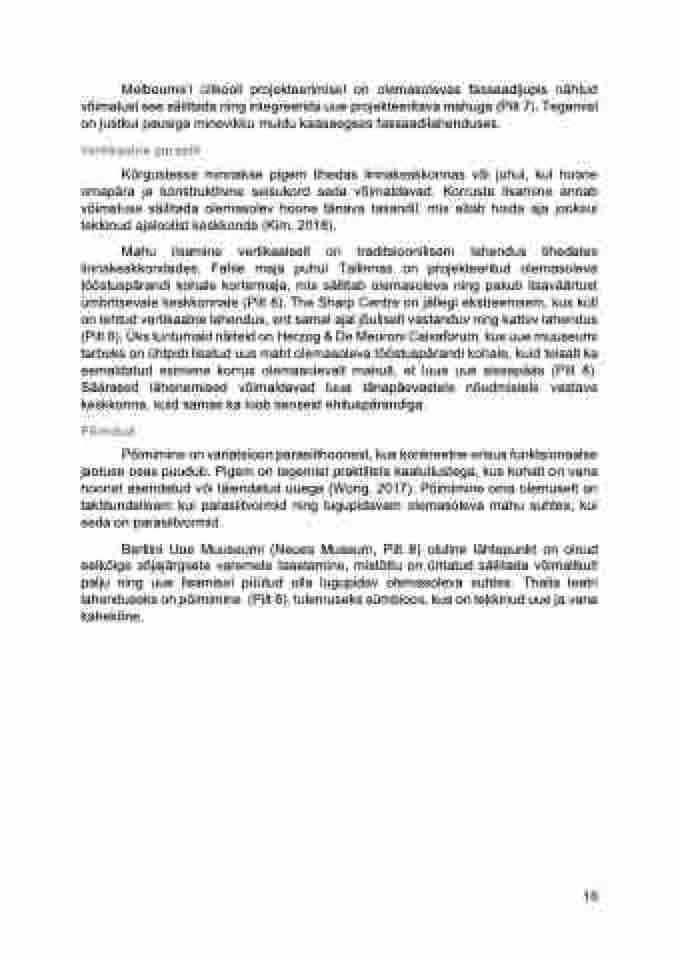 Mahu lisamine vertikaalselt on traditsioonilisem lahendus tihedates linnakeskkondades. Fahle maja puhul Tallinnas on projekteeritud olemasoleva tööstuspärandi kohale kortermaja, mis säilitab olemasoleva ning pakub lisaväärtust ümbritsevale keskkonnale (Pilt 8). The Sharp Centre on jällegi ekstreemsem, kus küll on tehtud vertikaalne lahendus, ent samal ajal jõuliselt vastanduv ning kattev lahendus (Pilt 8). Üks tuntumaid näiteid on Herzog & De Meuroni Caixaforum, kus uue muuseumi tarbeks on ühtpidi lisatud uus maht olemasoleva tööstuspärandi kohale, kuid teisalt ka eemaldatud esimene korrus olemasolevalt mahult, et luua uus sissepääs (Pilt 8). Säärased lähenemised võimaldavad luua tänapäevastele nõudmistele vastava keskkonna, kuid samas ka loob seoseid ehituspärandiga.