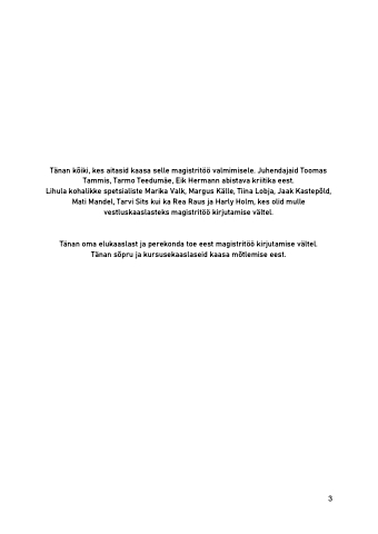 Tänan oma elukaaslast ja perekonda toe eest magistritöö kirjutamise vältel. Tänan sõpru ja kursusekaaslaseid kaasa mõtlemise eest.
