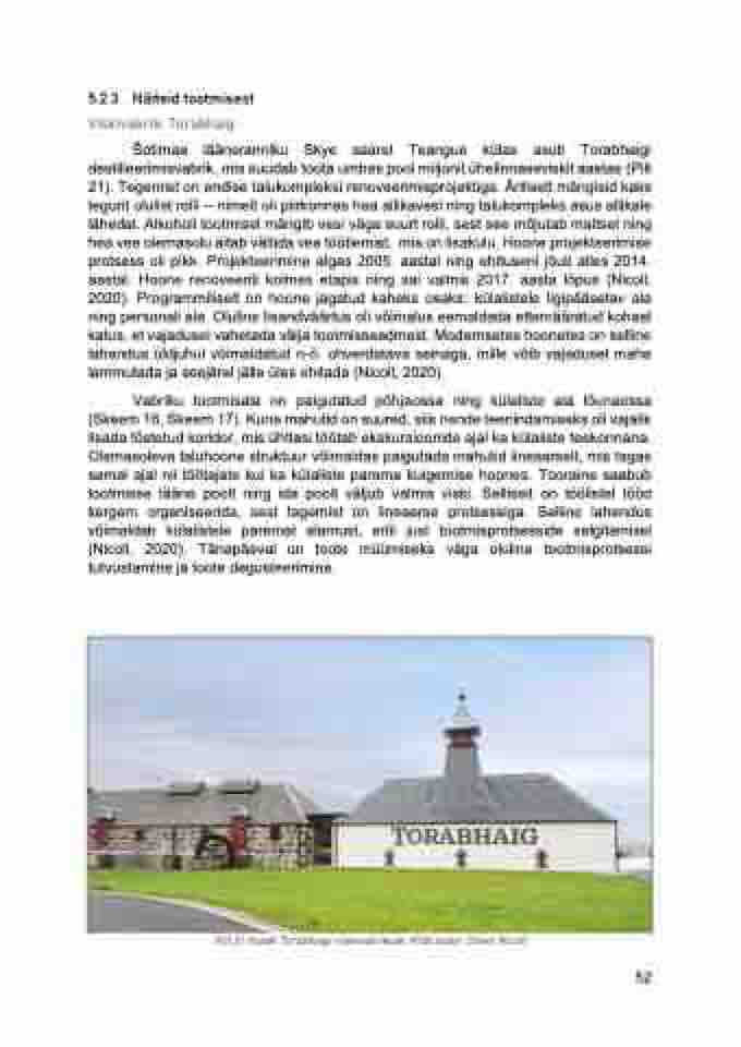 Šotimaa lääneranniku Skye saarel Teangue külas asub Torabhaigi destilleerimisvabrik, mis suudab toota umbes pool miljonit ühelinnaseviskit aastas (Pilt 21). Tegemist on endise talukompleksi renoveerimisprojektiga. Äriliselt mängisid kaks tegurit olulist rolli -- nimelt oli piirkonnas hea allikavesi ning talukompleks asus allikale lähedal. Alkoholi tootmisel mängib vesi väga suurt rolli, sest see mõjutab maitset ning hea vee olemasolu aitab vältida vee töötlemist, mis on lisakulu. Hoone projekteerimise protsess oli pikk. Projekteerimine algas 2005. aastal ning ehituseni jõuti alles 2014. aastal. Hoone renoveeriti kolmes etapis ning sai valmis 2017. aasta lõpus (Nicoll, 2020). Programmiliselt on hoone jagatud kaheks osaks: külalistele ligipääsetav ala ning personali ala. Oluline lisandväärtus oli võimalus eemaldada ettemääratud kohast katus, et vajadusel vahetada välja tootmisseadmeid. Modernsetes hoonetes on selline lahendus üldjuhul võimaldatud n-ö. ohverdatava seinaga, mille võib vajadusel maha lammutada ja seejärel jälle üles ehitada (Nicoll, 2020).