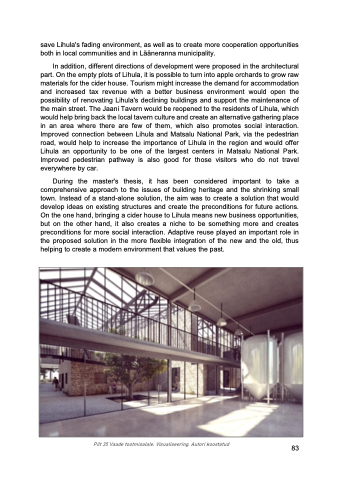 In addition, different directions of development were proposed in the architectural part. On the empty plots of Lihula, it is possible to turn into apple orchards to grow raw materials for the cider house. Tourism might increase the demand for accommodation and increased tax revenue with a better business environment would open the possibility of renovating Lihula's declining buildings and support the maintenance of the main street. The Jaani Tavern would be reopened to the residents of Lihula, which would help bring back the local tavern culture and create an alternative gathering place in an area where there are few of them, which also promotes social interaction. Improved connection between Lihula and Matsalu National Park, via the pedestrian road, would help to increase the importance of Lihula in the region and would offer Lihula an opportunity to be one of the largest centers in Matsalu National Park. Improved pedestrian pathway is also good for those visitors who do not travel everywhere by car.